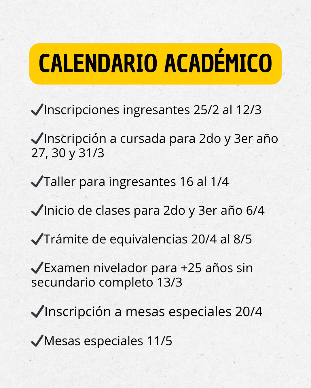 Calendario Académico 25 febrero, 202624 febrero, 2026 por Joana Paola Espinoza VOLVIMOS 🤓 ✍️Tomá nota!Les dejamos las fechas más importantes del Calendario Académico 2026 para esta primera parte del año.